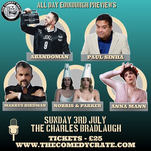 Jul 3 2:00 pm - 9:30 pm All Day Edinburgh Previews The Comedy Crate – The Charles Bradlaugh The Charles Bradlaugh 1 Earl St, northampton Event Details Get Directions